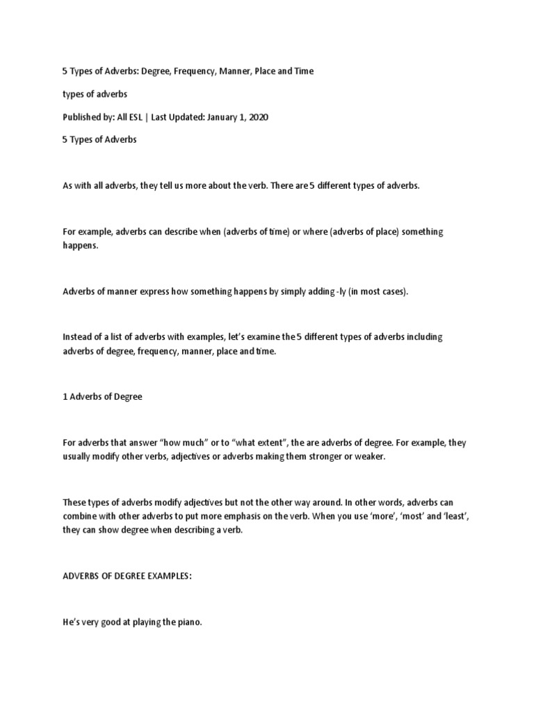 Adverbs Manner Place Time Esl Worksheet By Rody from www.eslprintables.com Despite the subtle differences between these 5 types of adverbs, let's hear some adverb. To start, there are five types of adverbs you should familiarize yourself with: The brothers were badly injured in the fight. Despite the subtle differences between these 5 types of adverbs, let's hear some adverb examples. For example he ran doesn't say much about how he ran. To be honest, i'm not sure what type of adverb it is. All things considered, adverbs are common parts of speech and sentence structure. You start off mannerslowly timein the beginning.